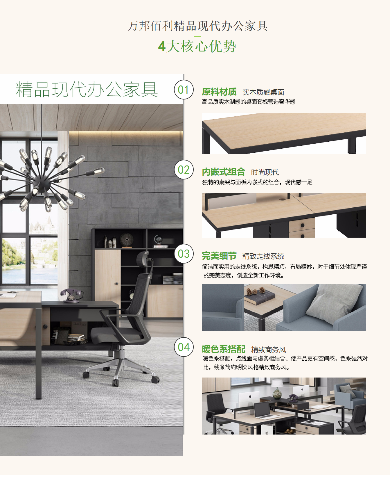 北京萬邦佰利家具有限公司是一家專注于辦公家具生產(chǎn)、批發(fā)銷售的公司。銷售的產(chǎn)品有:班臺、經(jīng)理桌椅、會議桌椅、員工桌椅、文件柜、密集柜、視屏會議桌、辦公沙發(fā)、學校家具、銀行家具、戶外家具、醫(yī)院家具等產(chǎn)品,公司自成立以來始終堅持以人才為本、誠信立業(yè)的經(jīng)營原則,堅持用企業(yè)文化提升企業(yè)核心競爭力,使企業(yè)在發(fā)展中處于良好的形象.我公司主要服務于企業(yè)單位的家具定制服務,為各大企業(yè)量身定做整體環(huán)境的家具設計全程服務,我們的整體產(chǎn)品服務...